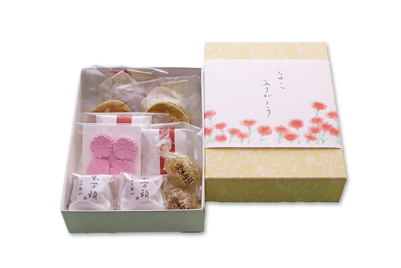 恵那寿や自慢の栗菓子とカーネーションのお干菓子の詰合せでございます。