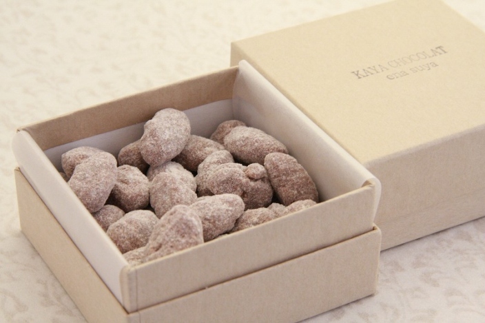 古来より食されてきた和風ナッツ《かやの実》を丁寧にあく抜きをし、香ばしく焼き上げ、キャラメリゼし風味豊かなミルクチョコレートをかけました。和製ナッツとチョコレートのハーモニーをお楽しみいただけます。ビターよりもマイルドに仕上げるためチョコレートの周りには和三盆糖をかけてあります。